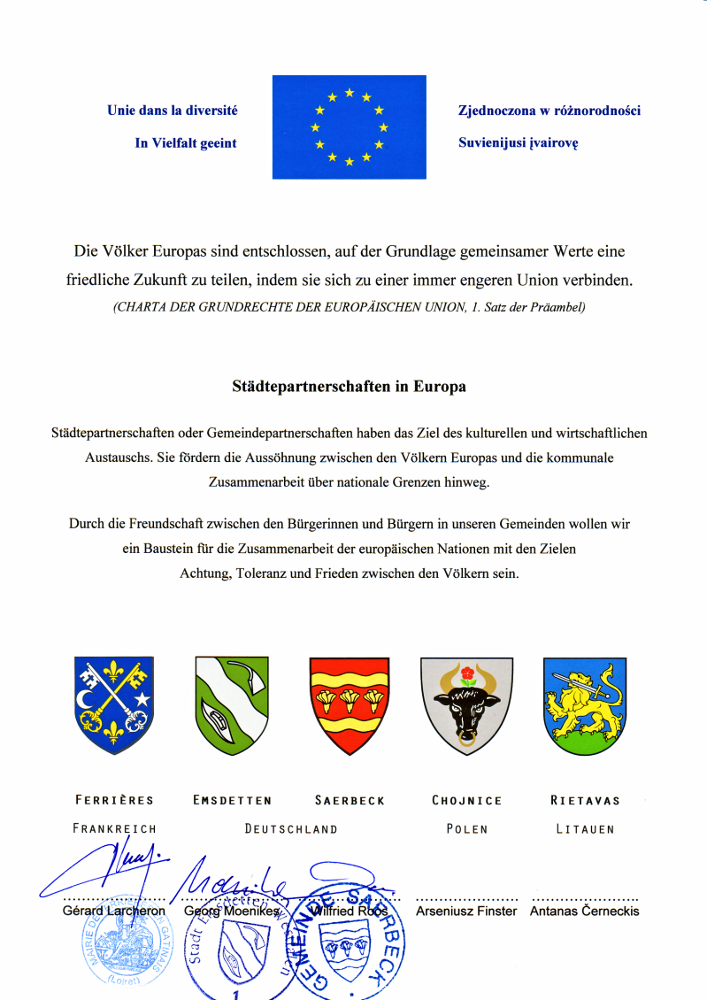 Während einer der letzten Begegnungen zwischen Saerbeck und Rietavas faßte ein Mitglied unseres Vereins deshalb den Entschluß, den Weg zwischen unseren beiden Partnergemeinden nicht wie üblich mit dem Auto oder mit dem Flugzeug, sondern zu diesem Anlaß gemeinsam mit einem Freund auf dem Fahrrad zurückzulegen. Nach Recherchen im Internet entschloß man sich, größtenteils dem Verlauf des europäischen Radwegs R1 zu folgen und diesen nur deshalb für einige Tage zu verlassen, um im polnischen Chojnice, der Partnerstadt von Saerbecks Nachbarort Emsdetten, eine Unterschrift für eine mitgeführte Urkunde abzuholen. Diese Urkunde trägt zu diesem Zeitpunkt bereits die Unterschriften von Emsdetten und Saerbeck und seiner französischen Partnerstadt Ferrières. Nachdem sie zum Schluß bis nach Rietavas gebracht und dort ihre letzte Unterschrift erhalten wird, soll sie gleichsam als ein Beweisstück für den Wunsch zur Völkerverständigung in Europa dienen.